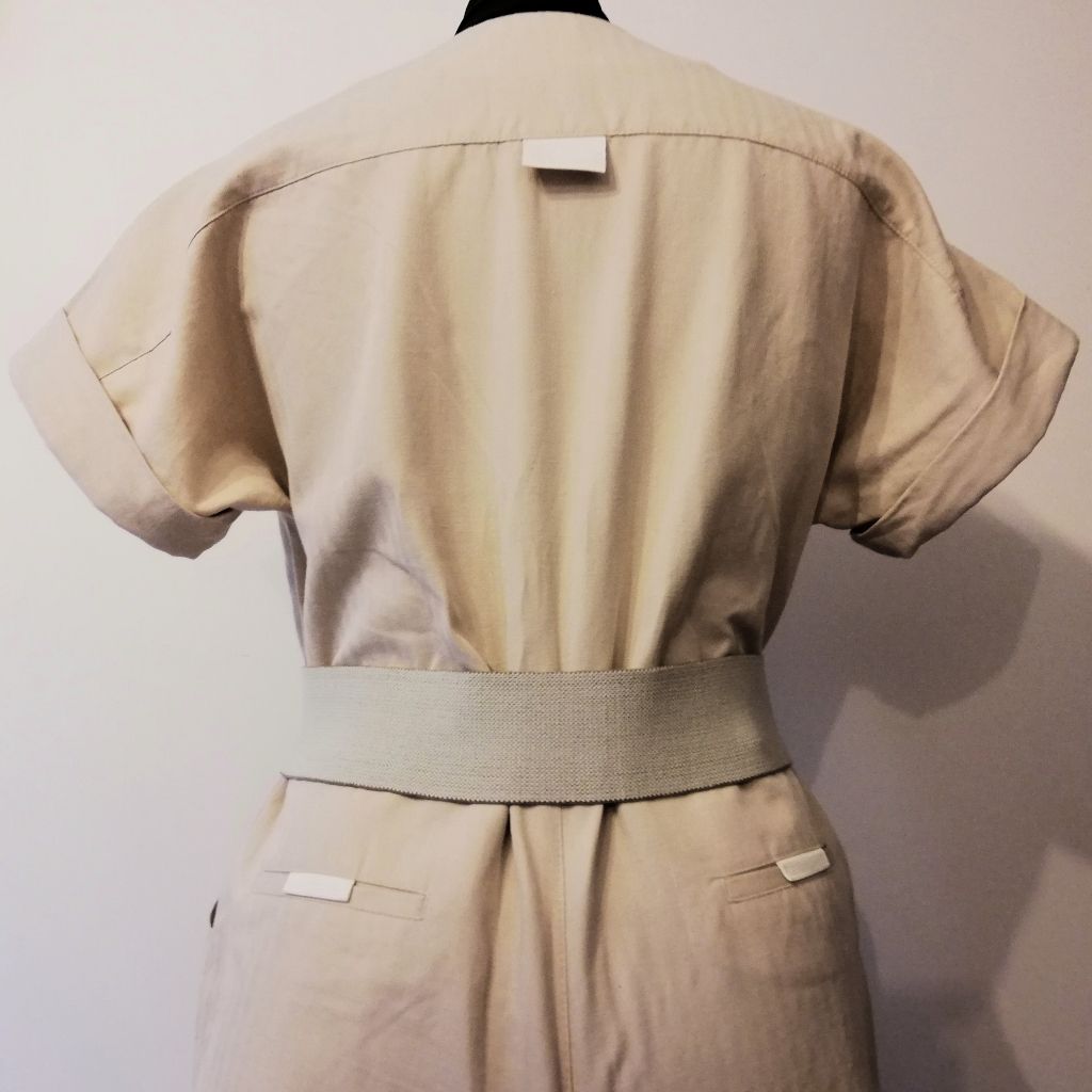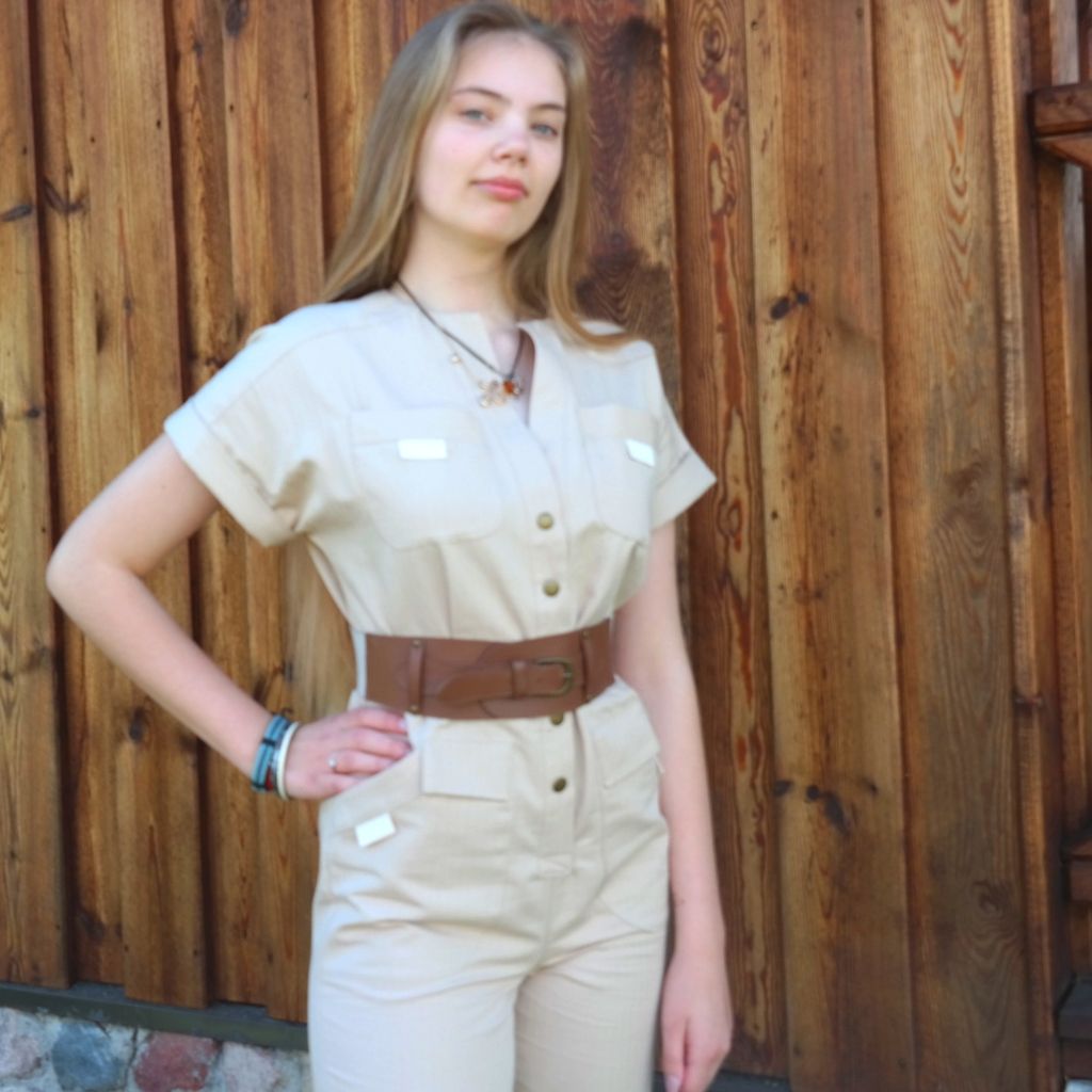 This version is made from linen and cotton-blend with cream color fabric and pockets on the jacket and pants sections.