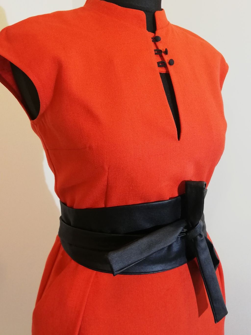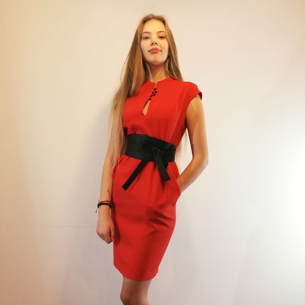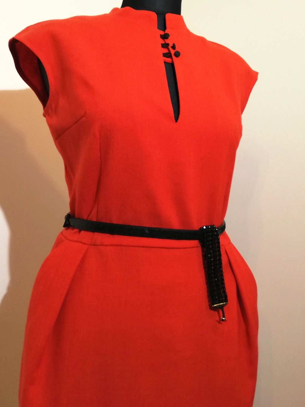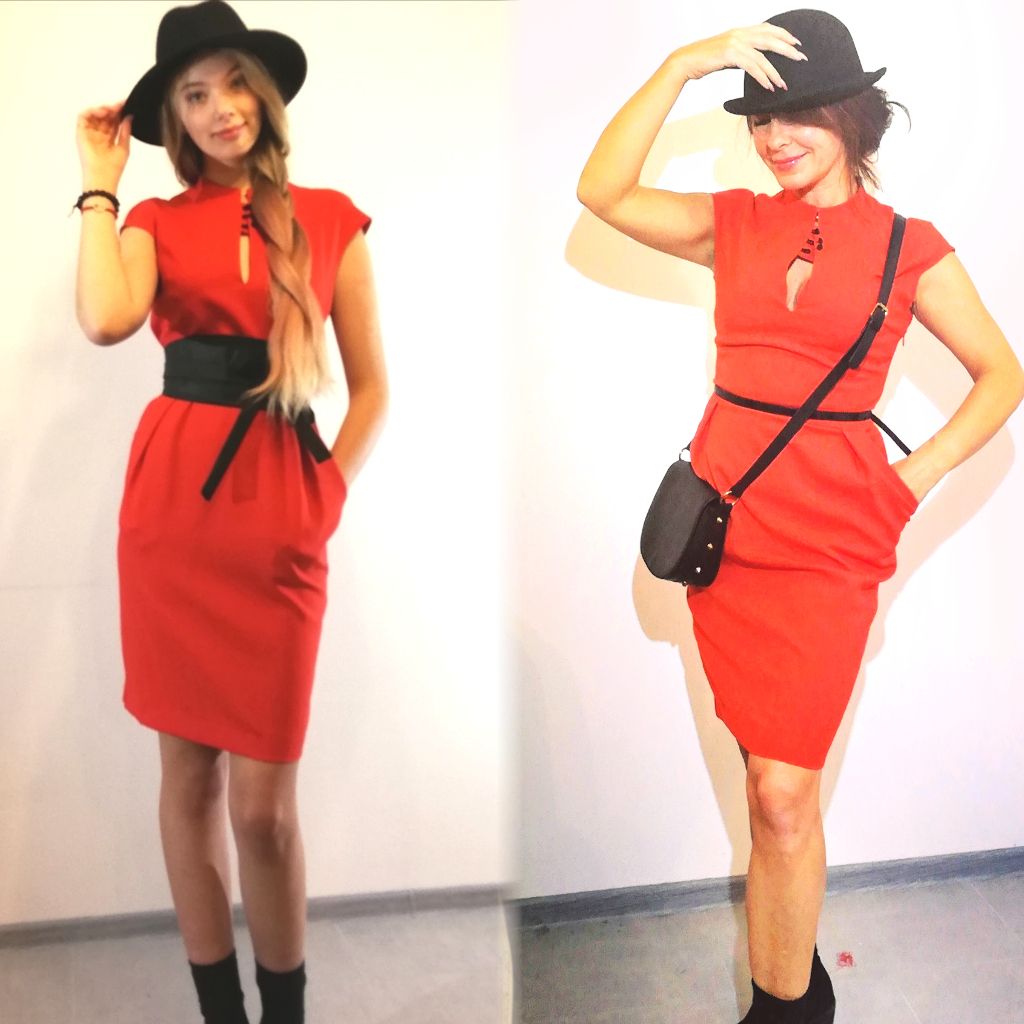 Made from a viscose red color fabric with small black buttons. The skirt part is pencil shaped with side seam pockets.