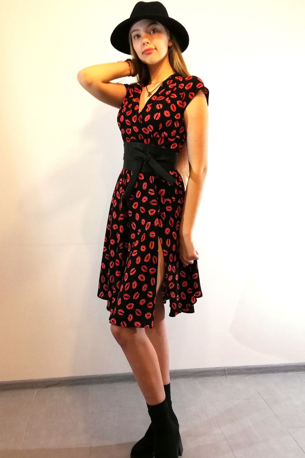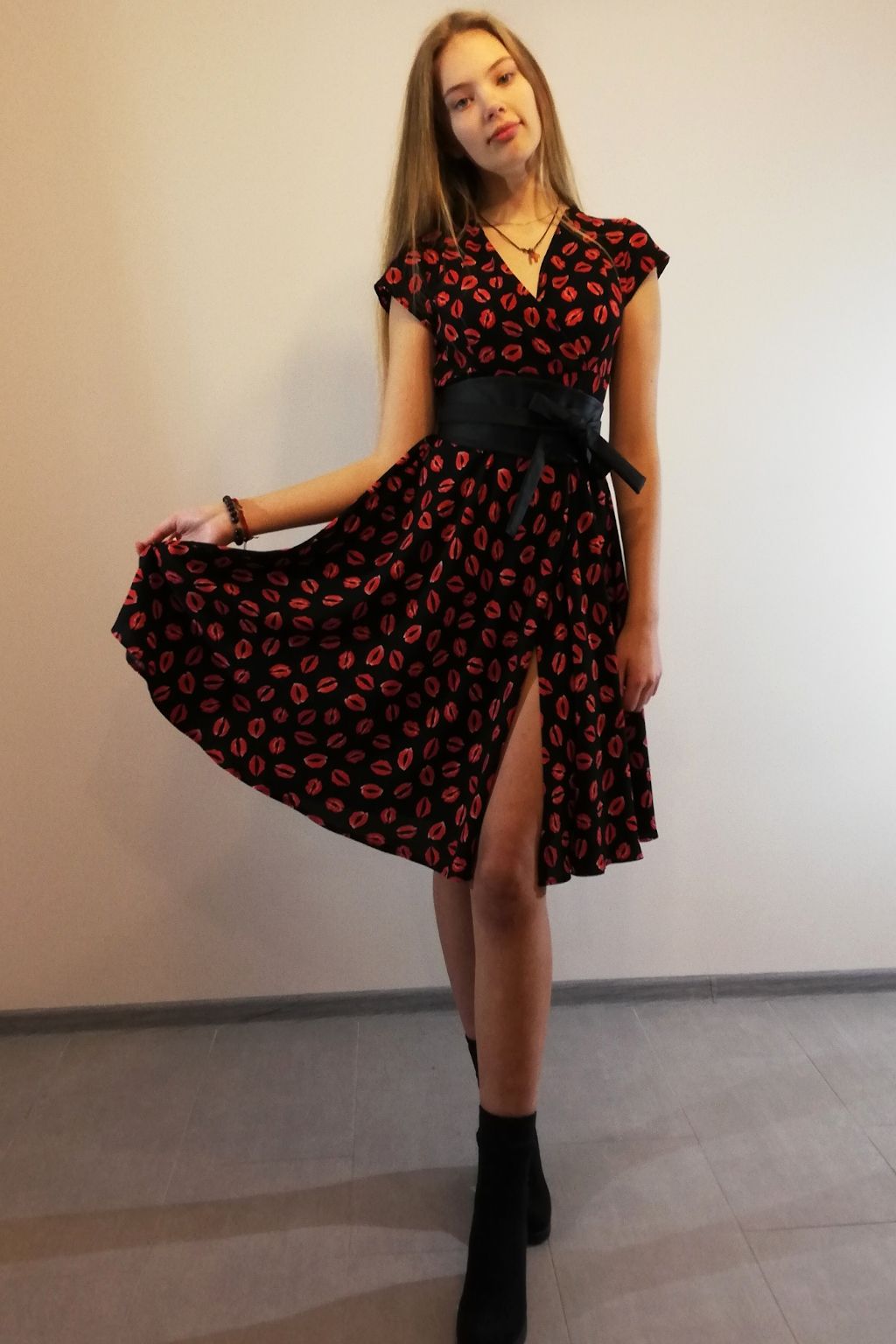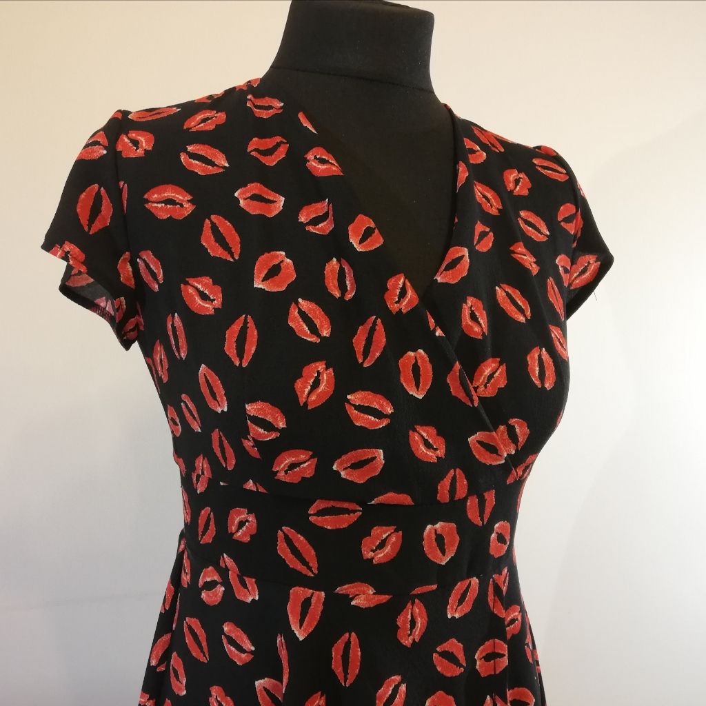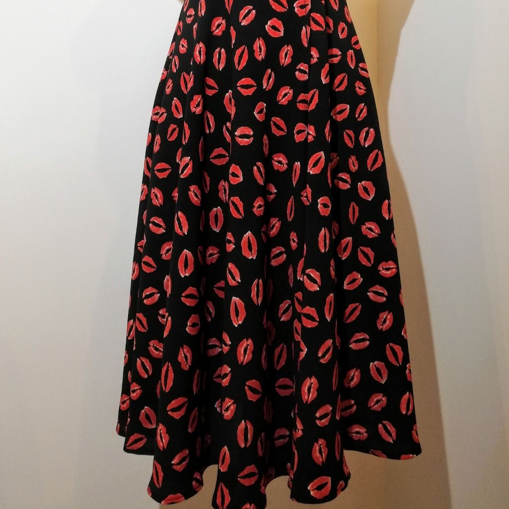 This is playful-sly in a red lip pattern and figure flattering dress. If you are not afraid of challenges, enhance yourself with this beauty.